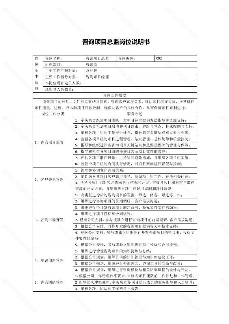 咨询公司项目经理、项目总监、高级咨询师、咨询师全套岗位说明书